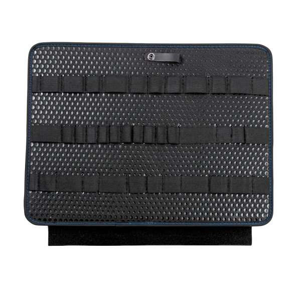 Sowohl auf der Vorder- als auch auf der RĂŒckseite dieser Abdeckplatte befinden sich tool loops in unterschiedlichen GröĂen, damit alle Arbeitsutensilien an ihrem vorgesehenen Platz bleiben und ein bestmöglicher Ăberblick ĂŒber das Inventar des B&W tool.case flex Werkzeugkoffers geboten werden kann.