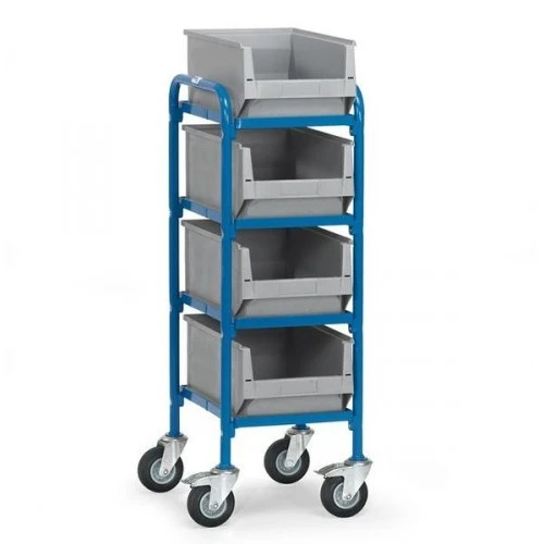 Baukasten-System: Stahlrohr- und Profilstahl geschweiĂt, pulverbeschichtet blau RAL 5007, Schraubkonstruktion. 4 Lenkrollen, Naben mit Rollenlager. 2 StĂŒck mit Feststeller, gemÀà der EuropĂ€ischen Norm EN 1757-3. Zerlegte Anlieferung. 4 Etagen mit Holzwerkstoffplatten, Rand 12 mm hoch und 4 SichtlagerkĂ€sten (LxBxH: 500/450x310x200 mm). Tragkraft pro LadeflĂ€che 60 kg.