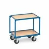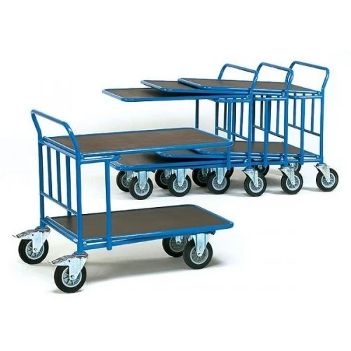 Stahlrohrkonstruktion, pulverbeschichtet, LadeflÀche: rutschsichere Siebdruckplatte aus wasserfestem Sperrholz. 2 Lenk- und 2 Bockrollen, Feststeller an den Lenkrollen, gemÀà der EuropÀischen Norm EN 1757-3. Ineinanderschiebbare Wagen, 75% Stellraum-Einsparung. Gesamtbreite: 650 mm. Tragkraft oberer Boden 80 kg.