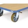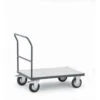 Stahlrohr und Profilstahl geschweiĂt, pulverbeschichtet RAL 5007, Plattform Holzwerkstoffplatten, OberflĂ€che Buchendekor. 2 Lenk- und 2 Bockrollen, Naben mit Rollenlager. Feststeller an den Lenkrollen, gemÀà der EuropĂ€ischen Norm EN 1757-3 (Sicherheit von Plattformwagen). StirnwĂ€nde aus Holzwerkstoffplatten, OberflĂ€che Buchendekor. Stirnwandhöhe: 500 mm.