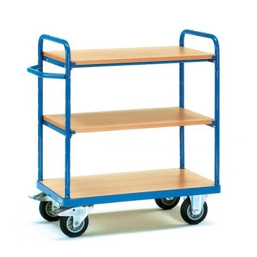 Baukasten-System: Aus Stahlrohr und Profilstahl geschweiĂt, pulverbeschichtet blau RAL 5007, Schraubkonstruktion. StirnwĂ€nde in 3 Höhen, wahlweise offen oder mit vertikalen Rohrstreben im Abstand von 130 mm. 1 fester und 2 bzw. 3 Einlegeböden aus Holzwerkstoffplatten, OberflĂ€che Buchendekor. Einlegeböden variabel einsetzbar, Teilung 90 bzw. 100 mm. Tragkraft pro Einlegeboden 90 kg. 2 Lenk- und 2 Bockrollen, Naben mit Rollenlager. Feststeller an den Lenkrollen, gemÀà der EN 1757-3 (Sicherheit von Plattformwagen).