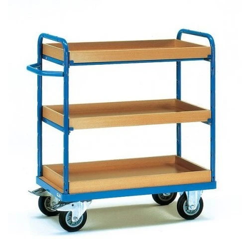 Baukasten-System: Aus Stahlrohr und Profilstahl geschweiĂt, pulverbeschichtet blau RAL 5007, Schraubkonstruktion. StirnwĂ€nde in 3 Höhen, wahlweise offen oder mit vertikalen Rohrstreben im Abstand von 130 mm. 1 fester und 2 bzw. 3 EinlegekĂ€sten aus Holzwerkstoffplatten, OberflĂ€che Buchendekor. EinlegekĂ€sten variabel einsetzbar, Teilung 90 bzw. 100 mm. Tragkraft pro Einlegekasten 120 kg. 2 Lenk- und 2 Bockrollen, Naben mit Rollenlager. Feststeller an den Lenkrollen, gemÀà der EN 1757-3 (Sicherheit von Plattformwagen).