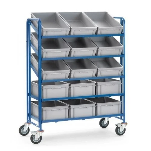 Baukasten-System: Stahlrohr und Profilstahl geschweiĂt, pulverbeschichtet blau RAL 5007, Schraubkonstruktion. 4 Lenkrollen, Naben mit Rollenlager. 2 StĂŒck mit Feststeller, gemÀà der EuropĂ€ischen Norm EN 1757-3. Variabel einschraubbare Etagen, Raster 150 mm, Neigung bei schrĂ€gem Einbau 15° oder 30°. Tragkraft pro LadeflĂ€che 60 kg. 5 Etagenrahmen mit KunststoffkĂ€sten 3 StĂŒck 600 x 400 x 145 mm, 6 StĂŒck 600 x 400 x 170 mm, 6 StĂŒck 600 x 400 x 220 mm.