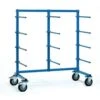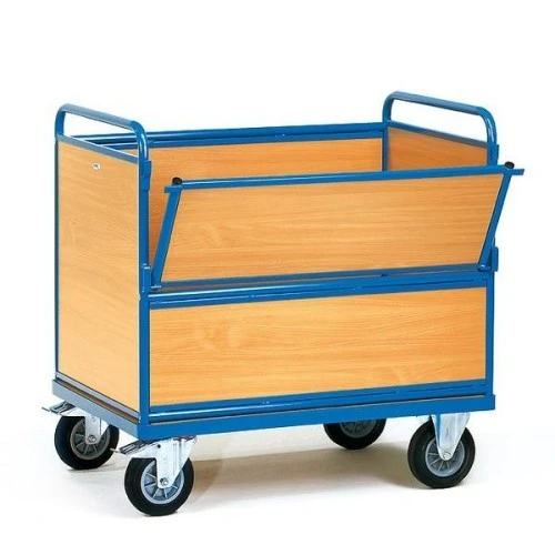 Stahlrohr und Profilstahl geschweiĂt, pulverbeschichtet blau RAL 5007. Verschraubte Baukasten-AusfĂŒhrung. Böden und WĂ€nde aus Holzwerkstoffplatte, OberflĂ€che Buchendekor. 2 Lenk- und 2 Bockrollen, Naben mit Rollenlager. Feststeller an den Lenkrollen, gemÀà der EuropĂ€ischen Norm EN 1757-3 (Sicherheit von Plattformwagen).