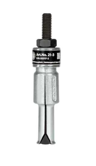 Großer Spreizbereich – große Abziehkraft. Die 2-schalige Ausführung mit extra großen Greifkanten ermöglicht ein sicheres Ausziehen. Robuste Ausführung für hohe Leistung und lange Haltbarkeit. Die Lager werden vom Innenauszieher, durch die Bohrung, sicher erfasst und mittels der guten Spannwirkung schnell ausgezogen. Die Innenauszieher der Größen 1-6 wurden konstruktiv überarbeitet und mit einer innenliegenden Anschlagsicherung gegen Überspannungs- und Überlastungseinwirkungen versehen. (Patent angemeldet) Um ein Lager mit einem Innenauszieher ausziehen zu können wird stets eine Gegenstütze oder ein Gleithammer, Baureihe 22, benötigt. Bei besonders tief im Gehäuse liegenden Lagern können an die Innenauszieher die Verlängerungen (Baureihe 21-V) angeschraubt werden.