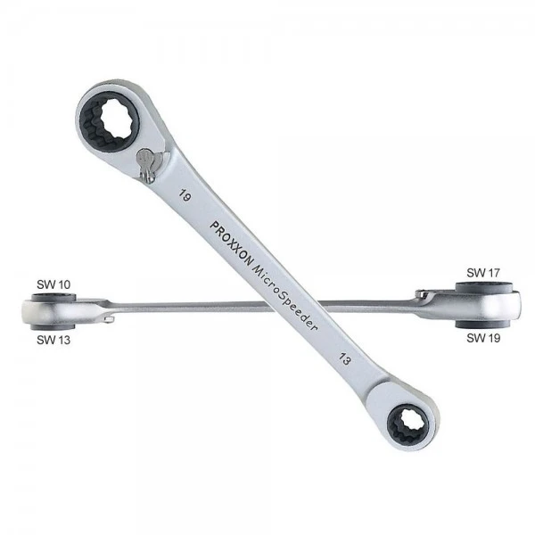 Der 4fach-MicroSpeeder ist im Vergleich zum Einsatz von zwei MicroSpeedern mit Doppelring 10 x 13 und 17 x 19 zwar etwas klobiger. Man kann bei GröĂe 13 und 19 auch nicht durchstecken. Aber dafĂŒr hat man nur ein Werkzeug in der Tasche!