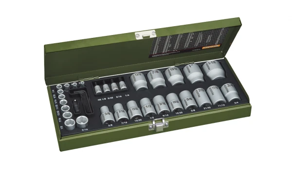 Einsätze für 1/4″-Vierkantantrieb (6,3 mm): 5/32″ – 3/16″ – 7/32″ – 1/4″ – 9/32″ – 5/16″ – 11/32″ – 13/32″ – 7/16″ – 1/2″ – 9/16″. HX-Schraubereinsätze 1/8″ – 5/32″ – 3/16″ – 1/4″.