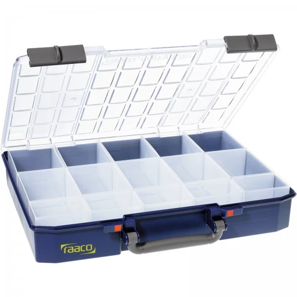 Sortimentskoffer mit EinsĂ€tzen; 5 StĂŒck Typ BA8-1, 10 StĂŒck Typ BA7-1. Inkl. SchiebeverschlĂŒssen und Tragegriff. 2 rote Markierungen an den VerschlĂŒssen zeigen an, ob der Koffer korrekt geschlossen ist. Mit U-Profilen im Deckel, die ein Verrutschen des Inhalts beim Transport verhindern.