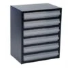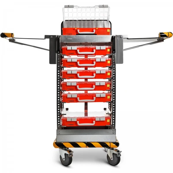Trolley mit Platz fĂŒr 7 CarryLite 5×10 Sortimentskoffer. Ausgestattet mit 2 klappbaren Seitenablagen zur Aufnahme von je einem CarryLite inkl. Magnetschloss zur Arretierung. Aufnahmen mit StopprĂ€ndern verhindern ein Herausrutschen der Koffer. Etikettenhalter fĂŒr Beschriftungszwecke. Der Trolley verfĂŒgt ĂŒber 4 Handgriffe fĂŒr einfaches Manövrieren sowie Rollen mit 2 Feststellbremsen und Kantenschutz.