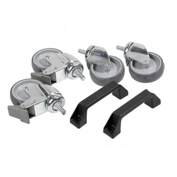 4 Gummirollen, davon 2 feststellbar, und 2 Handgriffe fĂŒr die Montage am Stativ.