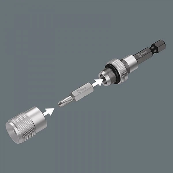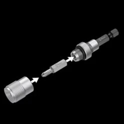 – 1 Abstandhalter 896/4/1 aus Aluminium, Schraubtiefe kann stufenlos eingestellt werden und ermöglicht das bündige Versenken von Schrauben; zur Aufnahme in die Schraubermaschine oder zum Einsatz in das Bohrfutter der elektronischen Bohrmaschine. 9 Trockenbau Bits mit angepasstem Abtriebsschaft, Länge 25 mm.
