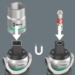 18-teilig; 1 Zyklop Pocket 8009 für 3/8″-Vierkant-Steckschlüsseleinsätze sowie 3/8″-Verbindungsteile mit Vierkantantrieb; ebenfalls geeignet für Bits mit 1/4″-Außensechskantantrieb nach DIN ISO 1173-C 6,3 und E 6,3 und Wera Anschluss-Reihen 1 und 4. 3/8″ Knarre und 1/4″ Bit-Ratschenschraubendreher; frei schwenkbarer Knarrenkopf; definierte Stellung bei 0°, 15° und 90° nach links und rechts; in 0°-Stellung einsetzbar wie ein konventioneller Schraubendreher; Links- /Rechtsumschaltung, feinverzahnt, kleiner Rückholwinkel von 5°; magnetische Direktaufnahme. Mehrkomponentiger Kraftform-Griff für ermüdungsarmes Arbeiten; im Griff integriertes unverlierbares und freischwenkbares Magazin mit 12 Bits, 1/4″, 25 mm lang; 1 Universalhalter (75 mm lang) mit Edelstahlhülse und starkem Dauermagnet, geeignet für die Aufnahme von Bits mit 1/4″-Außensechskantantrieb nach DIN ISO 1173-C 6,3 und Wera Anschluss-Reihe 1; 3 Zyklop Nüsse, 3/8″; 1 robustes textiles Halfter 9468 zum Befestigen am Gürtel; auch geeignet zum Andocken an das Wera 2go System.