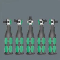 – 18-teilig; 1 Zyklop Pocket 8009 für 3/8″-Vierkant-Steckschlüsseleinsätze sowie 3/8″-Verbindungsteile mit Vierkantantrieb; ebenfalls geeignet für Bits mit 1/4″-Außensechskantantrieb nach DIN ISO 1173-C 6,3 und E 6,3 und Wera Anschluss-Reihen 1 und 4. 3/8″ Knarre und 1/4″ Bit-Ratschenschraubendreher; frei schwenkbarer Knarrenkopf; definierte Stellung bei 0°, 15° und 90° nach links und rechts; in 0°-Stellung einsetzbar wie ein konventioneller Schraubendreher; Links- /Rechtsumschaltung, feinverzahnt, kleiner Rückholwinkel von 5°; magnetische Direktaufnahme. Mehrkomponentiger Kraftform-Griff für ermüdungsarmes Arbeiten; im Griff integriertes unverlierbares und freischwenkbares Magazin mit 12 Bits, 1/4″, 25 mm lang; 1 Universalhalter (75 mm lang) mit Edelstahlhülse und starkem Dauermagnet, geeignet für die Aufnahme von Bits mit 1/4″-Außensechskantantrieb nach DIN ISO 1173-C 6,3 und Wera Anschluss-Reihe 1; 3 Zyklop Nüsse, 3/8″; 1 robustes textiles Halfter 9468 zum Befestigen am Gürtel; auch geeignet zum Andocken an das Wera 2go System.